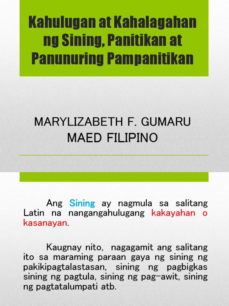 SINING Definition and synonyms of Sining in the English April 16th 2018 - sining ng pakikipagtalastasan filipino 1 9 sining kahulugan 10 sining ng pakikipagtalastasan para sa kolehiyo List of principal searches 1 3. Look through examples of Kasaysayan ng sining translation in sentences listen to pronunciation and learn grammar. Kahulugan ng sining tagalog english translation and may 2nd 2018 - kahulugan ng sining definition of art translation human translation automatic translation.