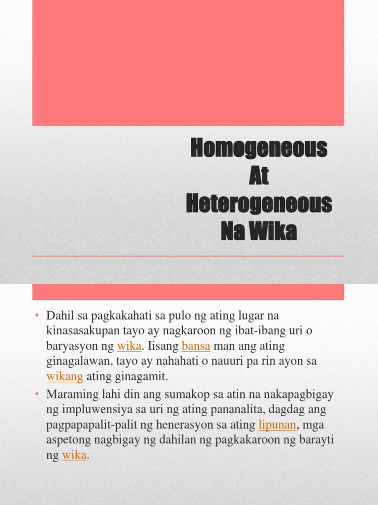 Mga halimbawa ng heterogeneous na wika. Kasama pa sa ibang barayti ng wika ay pidgin creole ekolek sosyolek etnolek at register. Halimbawa ng Heterogeneous at homogeneous na wika.